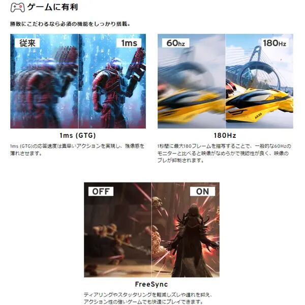 1ms(GTG)の高応答速度と180Hzという高リフレッシュレートにより、ゲームプレイも快適に。