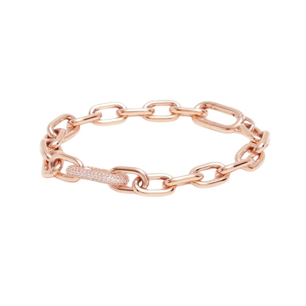 インダストリアルな要素と細部に散りばめられたクリスタルの洗練さが融合し、ローズゴールドリンクブレスレットはこれまでにないチェーンになりました。Crystal Linkコレクションの他のアイテムと合わせても、単体でも、主役級のパワフルなチェーンです。