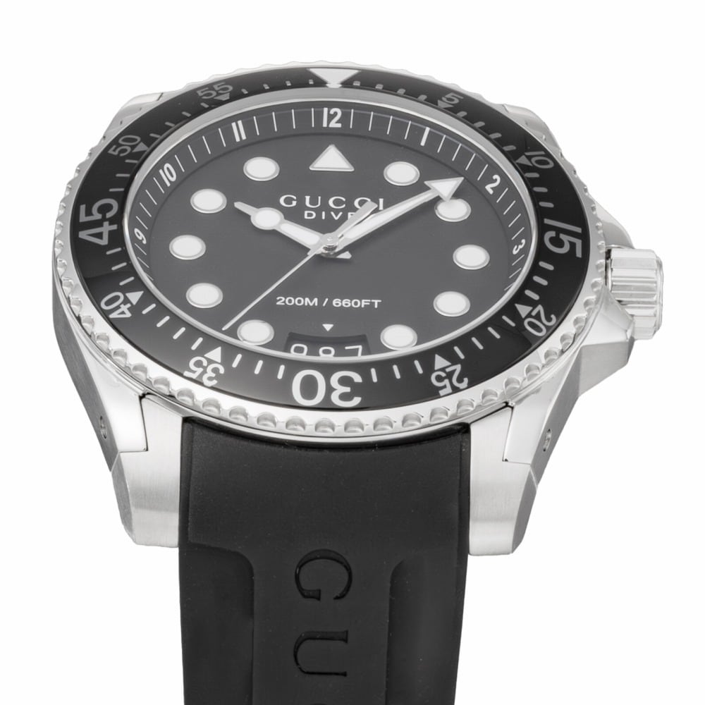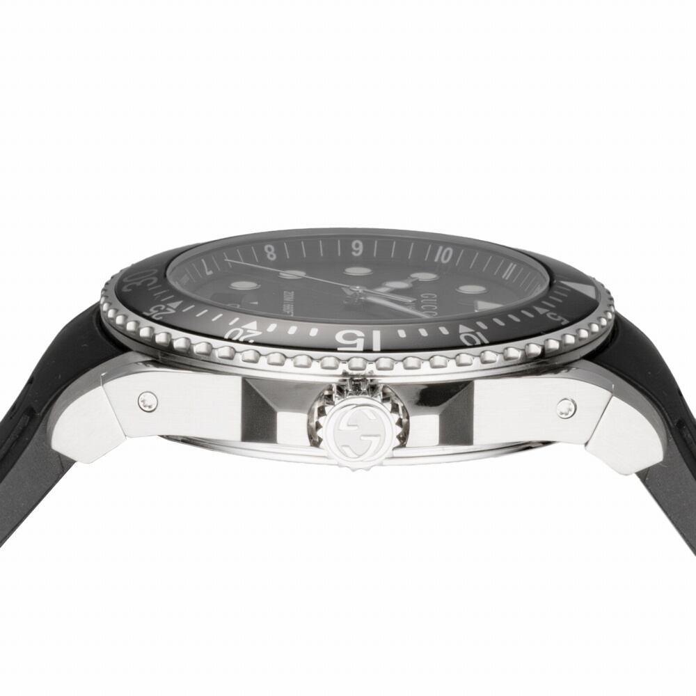 グッチ GUCCI DIVE YA136204B 腕時計 メンズ ブラック クオーツ アナログウォッチ 時計 プレゼント ギフト ブラック並行輸入品 グッチ(GUCCI)は、世界的に有名なイタリアのファッションブランドであり、衣服は勿論、バッグ・財布・靴・香水・時計など幅広く手がけている。シンプルで洗練されたデザインが人気の『GUCCI』。その洗練されたデザインは、ファッションを選ばず、あらゆるシーンにベストマッチ間違いなし。プレゼントやギフトにもおすすめ。 サイズ (約)H45×W45×D12mm(ラグ、リューズは除く)、重さ(約)145g、腕周り最大(約)19cm、最小(約)14cm 仕様 クオーツ、200M防水、カラー:ブラック(文字盤)、ブラック(ベルト) 付属品 ブランド純正BOX、保証書